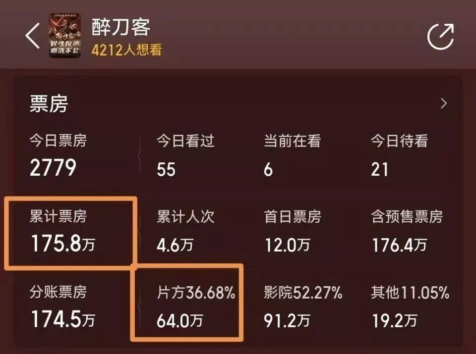 梦想很美好,现实很残酷,《醉刀客》院线票房176万,片方将回收64万,下映之后卖给流媒体还有几百万,片方至少亏损1000多万。