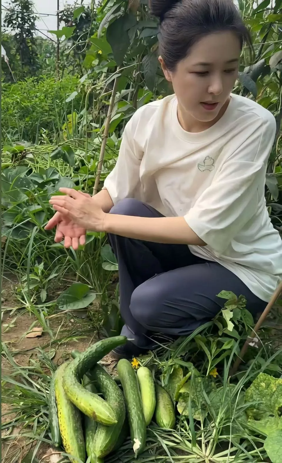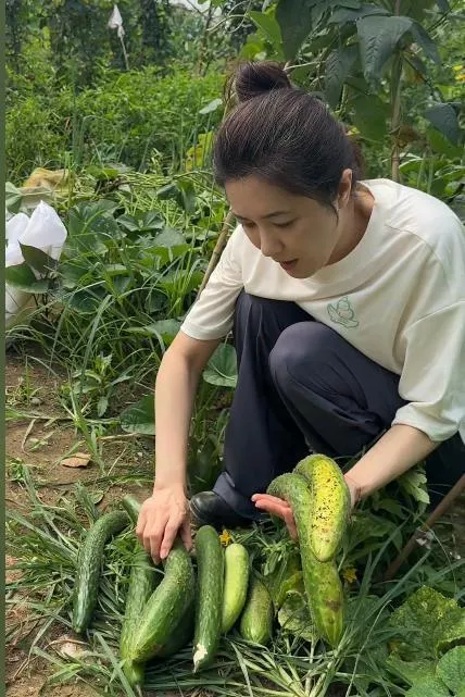 视频里,她穿着沾着泥土的旧T恤,蹲在菜地里徒手摘黄瓜,这蹲地姿势未免也太豪迈了,从背影看谁敢信这是位女星。
