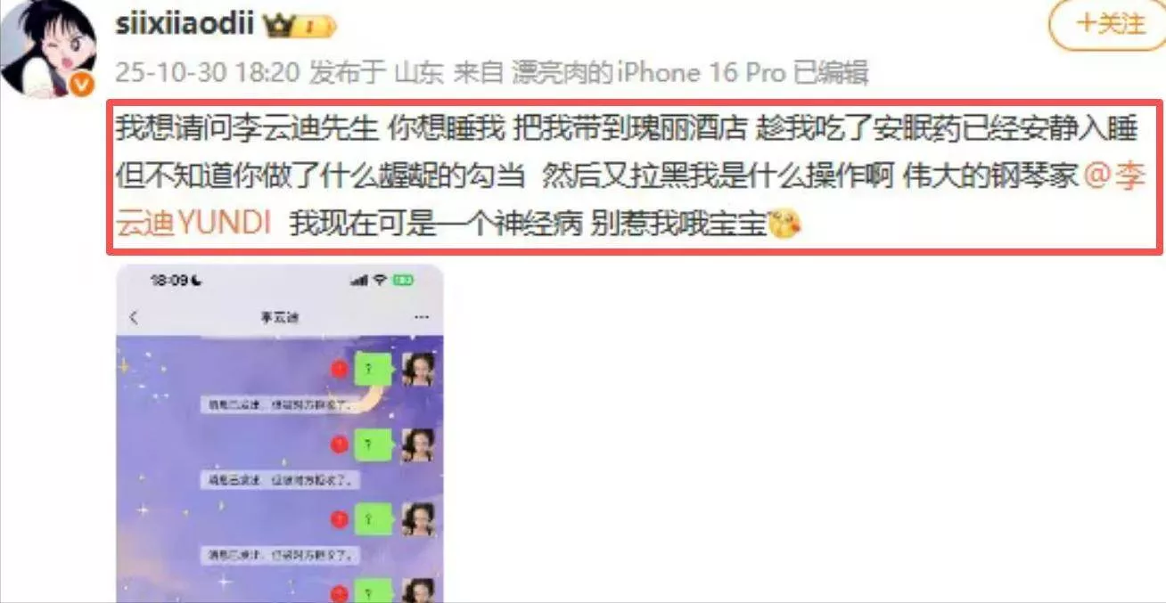 根据司晓迪的说法,李云迪曾将她带到酒店,在她因服用了药物而入睡时,李云迪做了不为人知的事情,事后竟把她拉黑。她显然对此事件十分愤怒,直接艾特李云迪,要求他给个解释。而她所晒出的聊天截图也确实显示,自己已经被李云迪拉黑。
