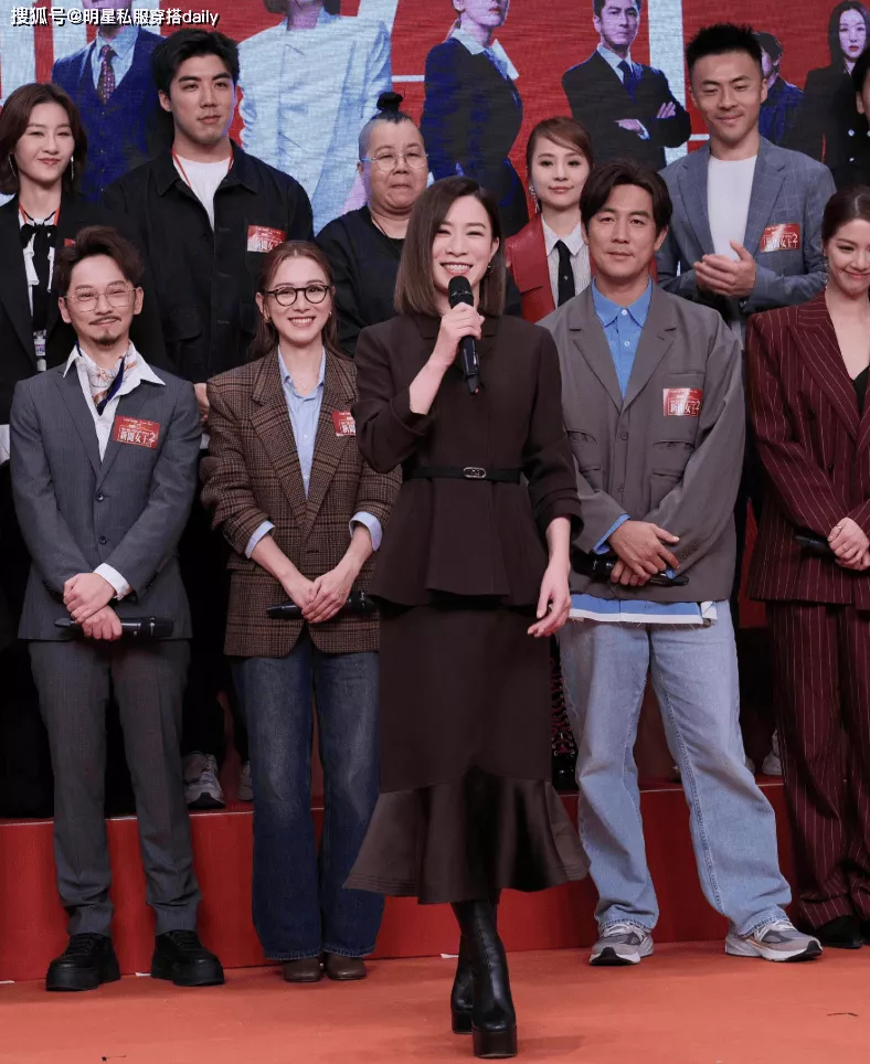 可以发现,她和《新闻女王》中的塑造的形象还是有些共同之处的!比如在正式场合,她总是打扮的一丝不苟!喜欢穿各种正装!比如最新晒出的花絮美照中,她身穿棕色西装夹克,搭配一根黑色细腰带,下半身搭配了一条同色系半身裙,优雅从容!