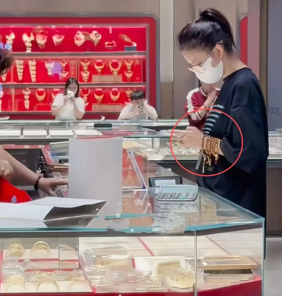 在曝光的画面中,她扎着高马尾,穿件几百块的黑色T恤,趴在黄金柜台前认真挑选,时不时还跟助理商量。
