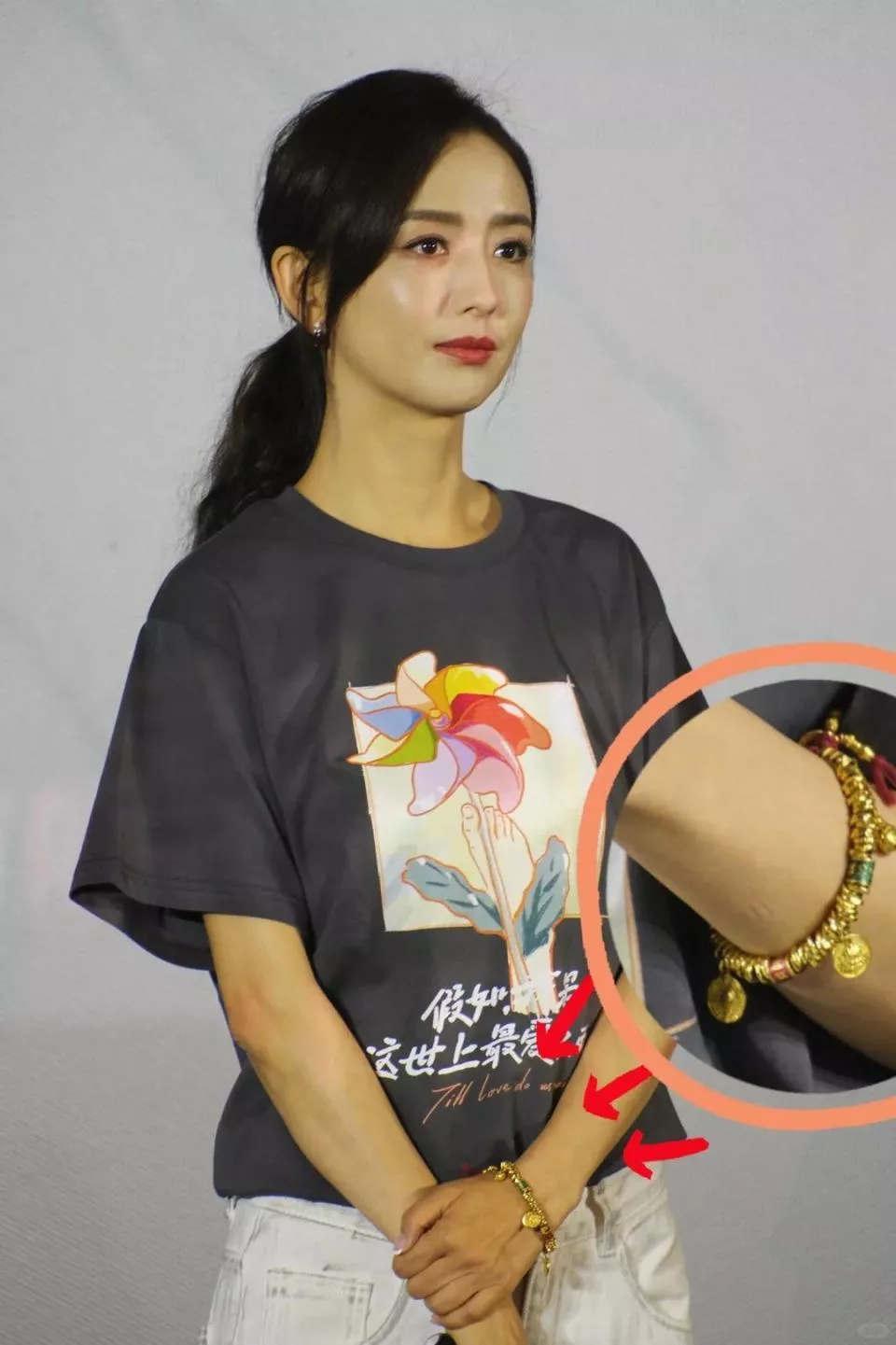 佟丽娅在深圳扫购黄金!头发稀少假发明显,满胳膊黄金手串太吸睛
