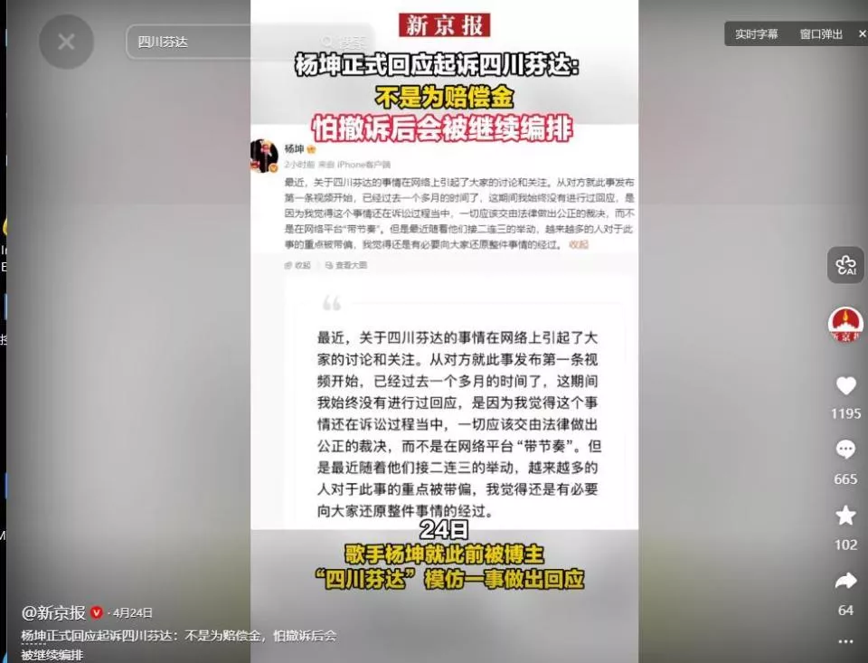 于是乎,在4月份的时候,杨坤正式起诉四川芬达,不是为了赔偿金,害怕撤诉后会被这两名网红继续编排。