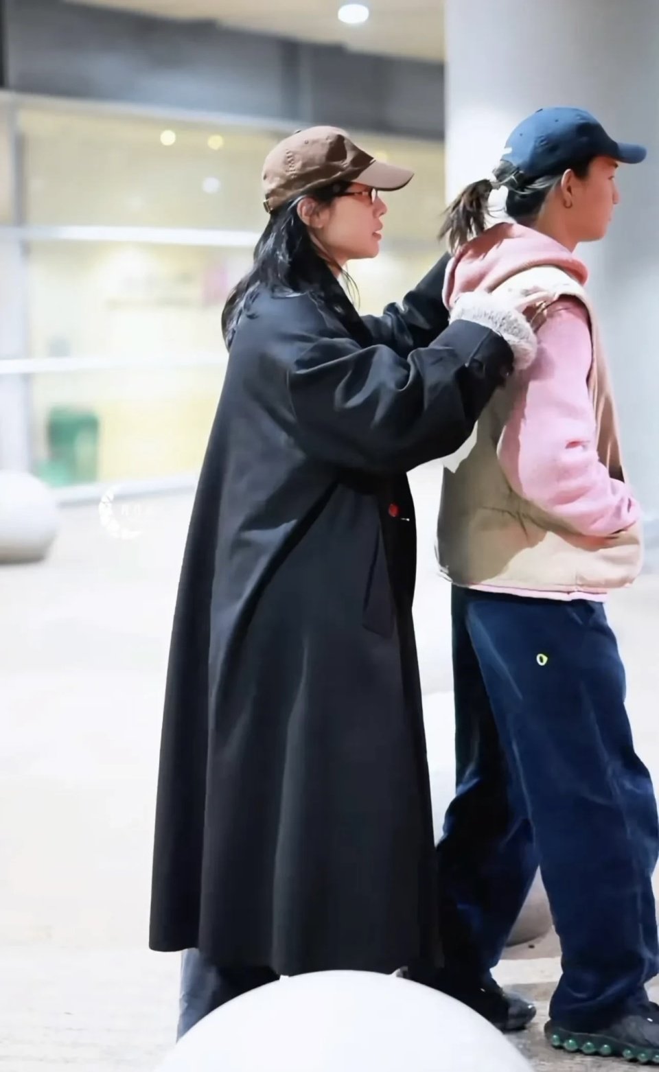 白百何穿了一件黑色的长风衣,戴着棒球帽、还有宽边框的眼镜,看她的侧脸很流畅,还是显得特别年轻。