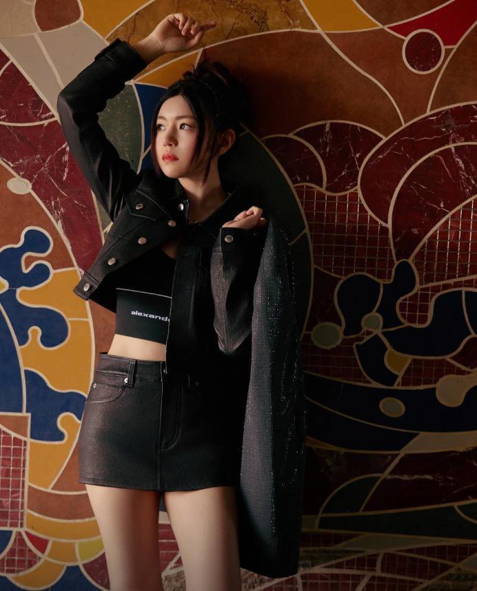 陈女士在涂鸦墙拍照时,身上穿着的一套黑色的皮衣套装,看起来质量很好的样子。