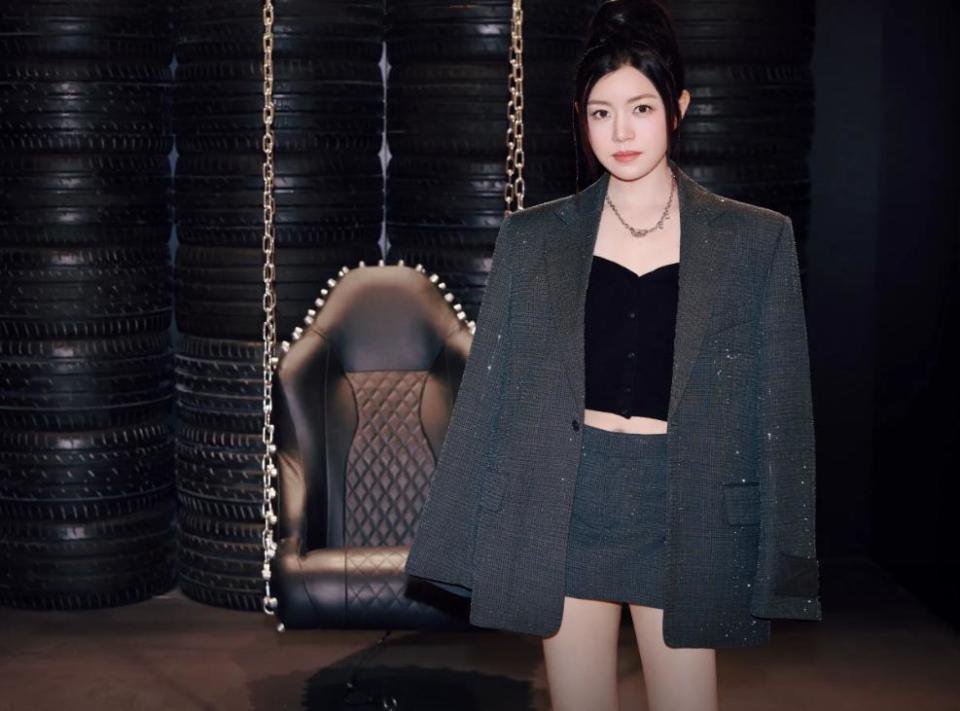 她为了自己显得比例更好一点,就在里面搭配了一件很短的黑色运动内衣。
