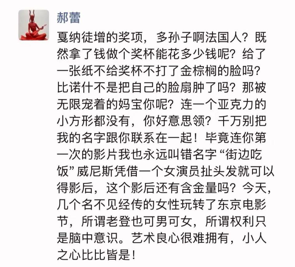 在评审文晏、演员叶璇先后针对风波发声之后,郝蕾也下场了,她发的朋友圈更狠、更尖锐。