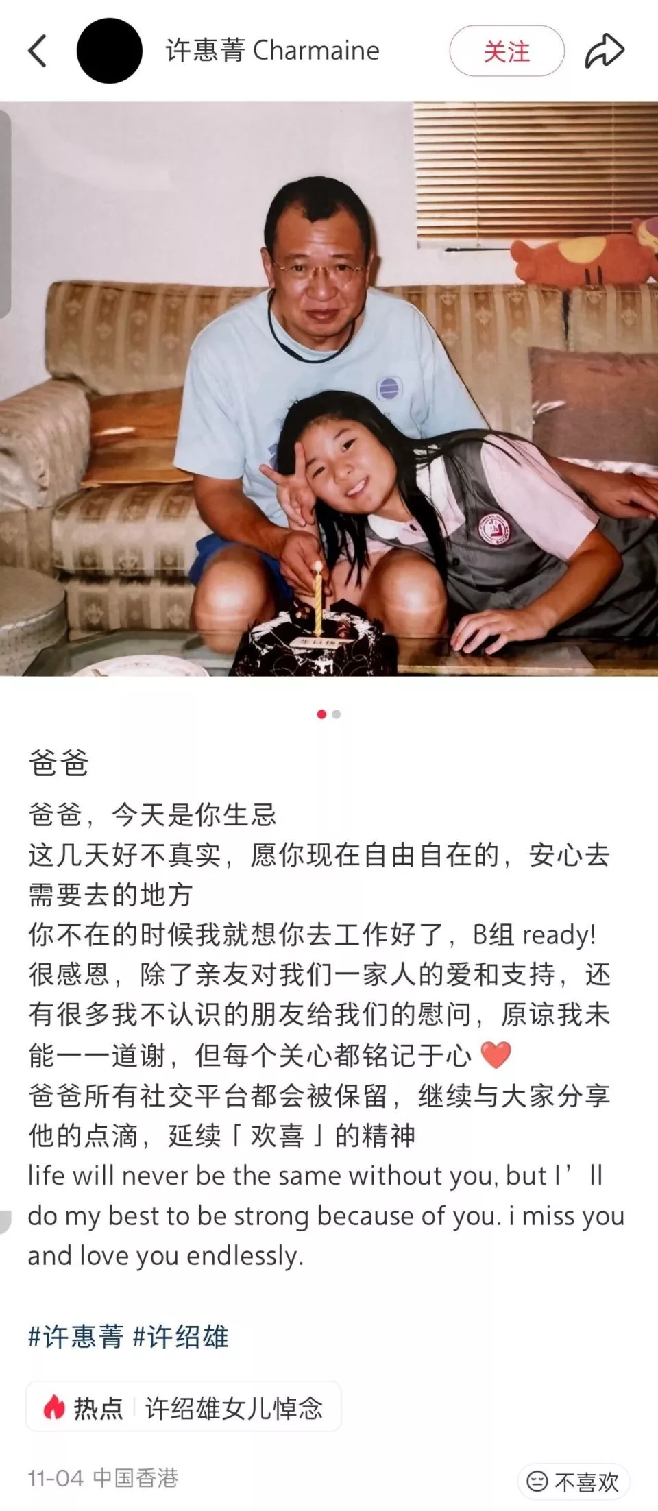 在许绍雄去世后第7天,许惠菁在社交媒体上发文悼念父亲道:“爸爸,今天是你生忌。这几天好不真实,愿你现在自由自在的,安心去需要去的地方。你不在的时候我就想你去工作好了,B组 ready!