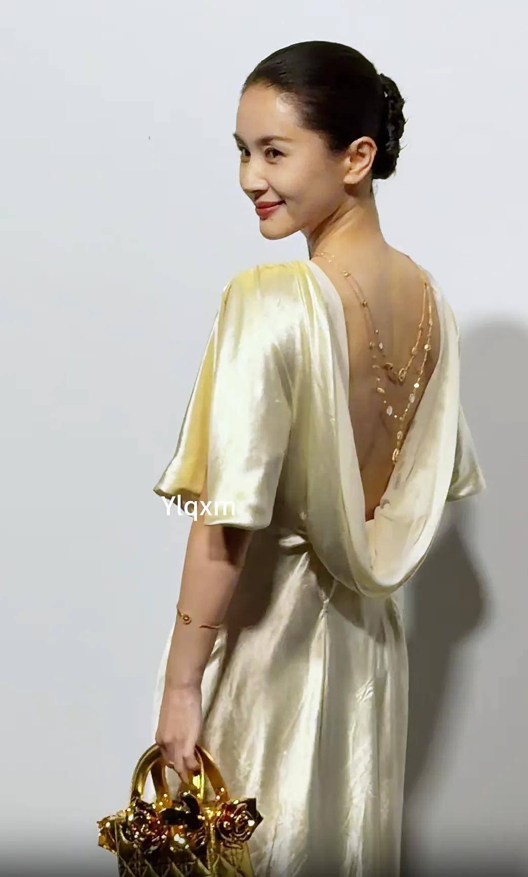 王子文在品牌方的安排下也拿了一只金色的包在身上展示,但这条米白色长裙有点像居家服,看着太普通了,甚至有点拖后腿。每次看她的生图总会感慨她那接近完美的头型,只能说拥有好看的头型和脸型的明星根本不需要什么高颅顶发型、强修容妆容修饰,简简单单就足够好看。她的整体造型,属于人比衣服和包都美。