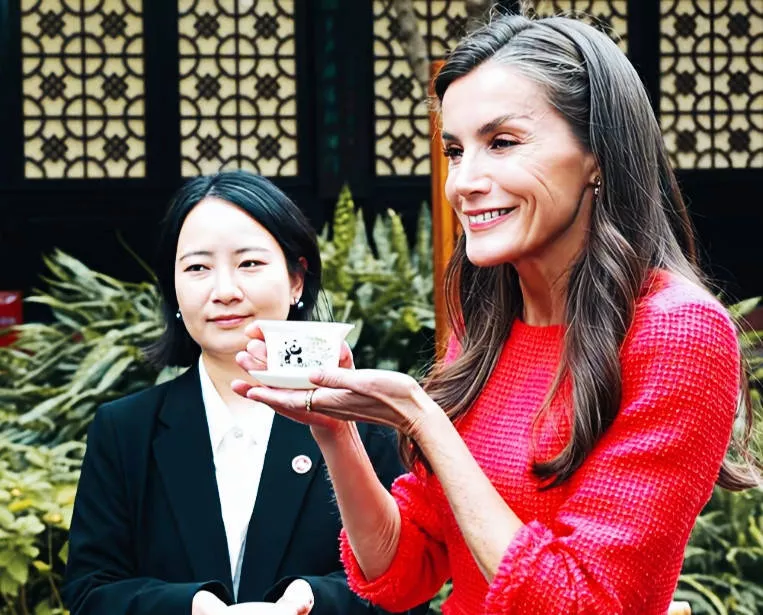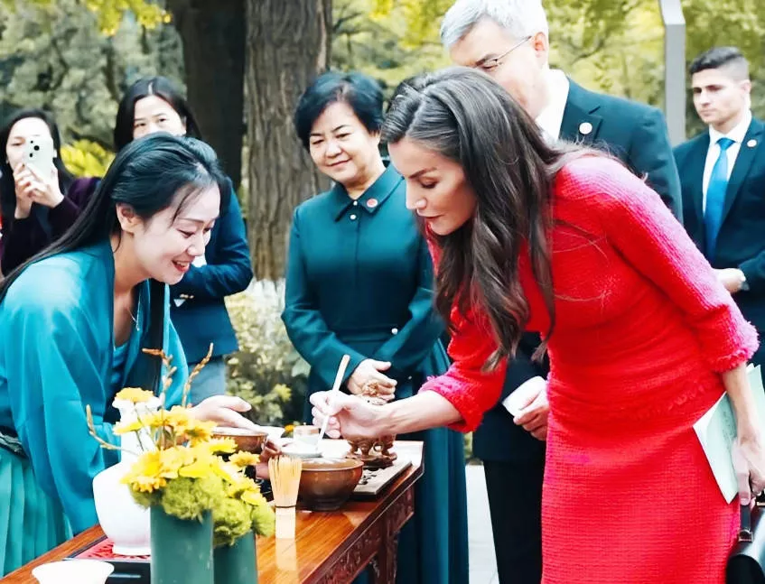 这场为纪念西班牙诗人安东尼奥.马查多诞辰 150 周年的活动,没有喧嚣的仪式,只有茶香与诗声交织。当茶艺师端来盖碗茶,王后低头垂眸学习点茶的模样,宛如一幅静止的油画 —— 她的指尖轻触茶盏,动作缓慢而认真,仿佛在对待一件稀世珍宝。