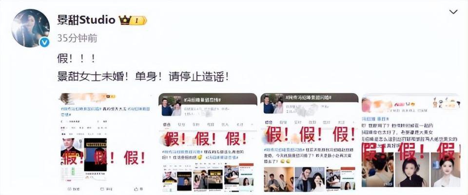 眼看文娱榜被这则消息霸占,景甜工作室率先炸毛,用三个感叹号甩出 “假!!!景甜女士未婚!单身!”