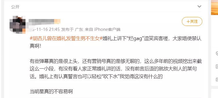 也有不少网友自发为胡杏儿澄清,力证她在婚后产下孩子前,每次都表示男女无所谓的,婚礼上说的就是调侃而已。