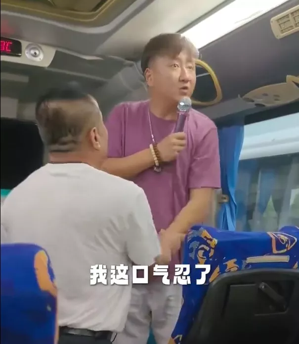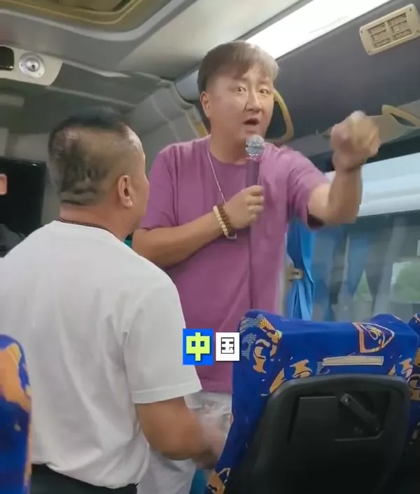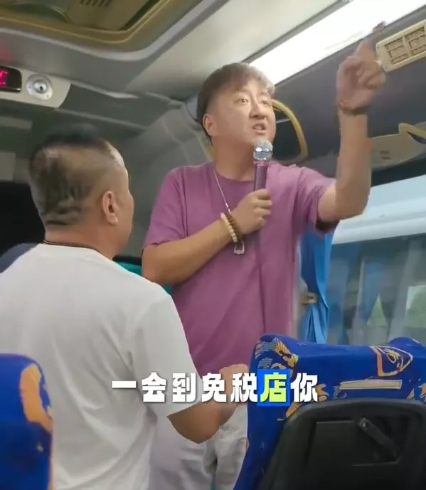 网传影片显示,在一辆旅游巴上,一名穿紫色上衣的男导游手持咪高峰向车上的团员说话,当时旁边有另外一名中年男子不断劝阻。紫衣男不停以手指指向团员,并且语气恶劣地表示:“我现在告诉你,这个大哥劝我,我这口气忍了,一会儿到免税店,你坚决上不了车,我告诉你,今天晚上我就让你回不了中国。”之后更要求拍片者删除影片。