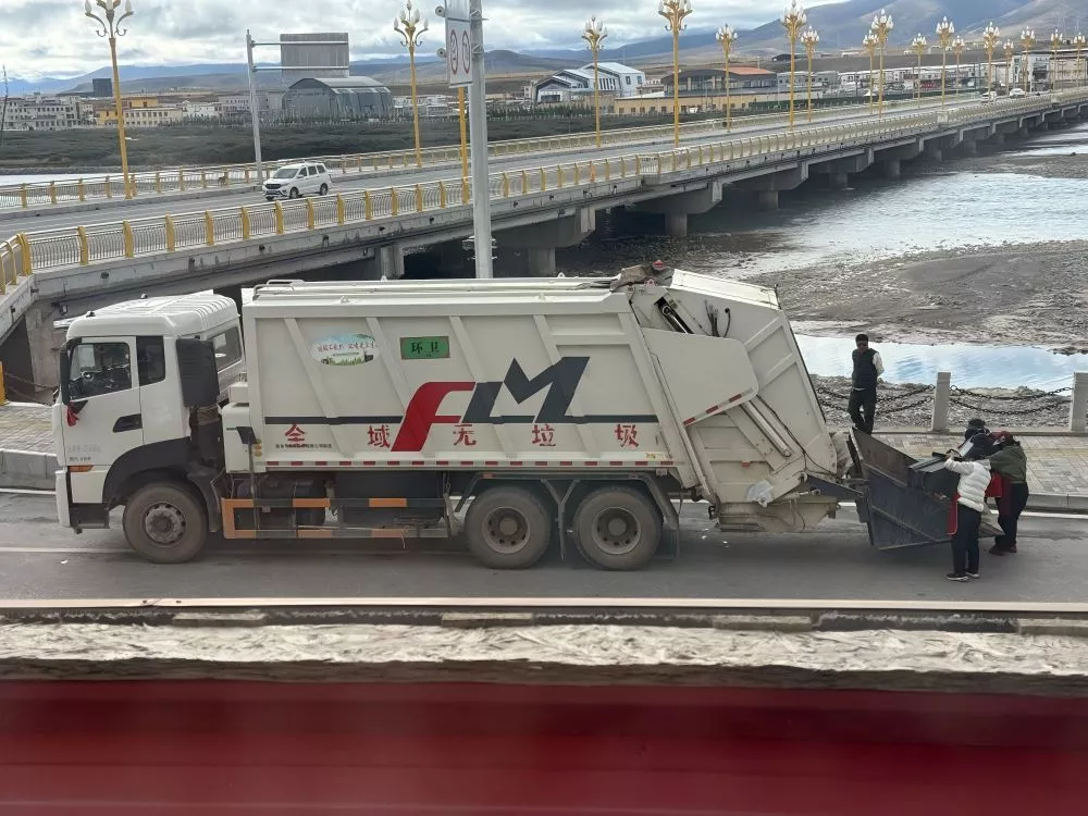 ▲9月20日10时许,一辆载重25吨的压缩垃圾车驶过治多县主街道,居民听到熟悉的《兰花草》旋律,纷纷出来倒垃圾。新京报记者