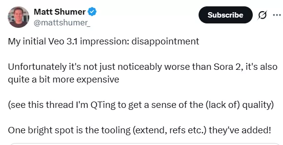 Otherside AI创始人Matt Shumer坦言“有些失望”,认为其“效果明显逊于Sora 2,价格却高出不少”。但他也承认,谷歌在参考图像支持和场景延伸等工具链方面的优势值得肯定。