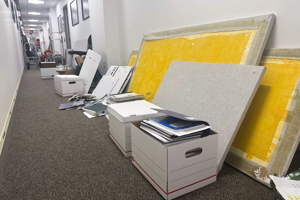 15日大批五角大厦记者收拾办公室,集体离开,走廊堆满杂物。(美联社)