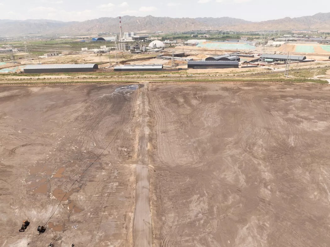 中国包头市,一个因稀土开采而枯竭的湖泊,湖中堆积着开采稀土后剩余的矿渣。背景中可见稀土精炼厂、钢铁厂和化工厂。