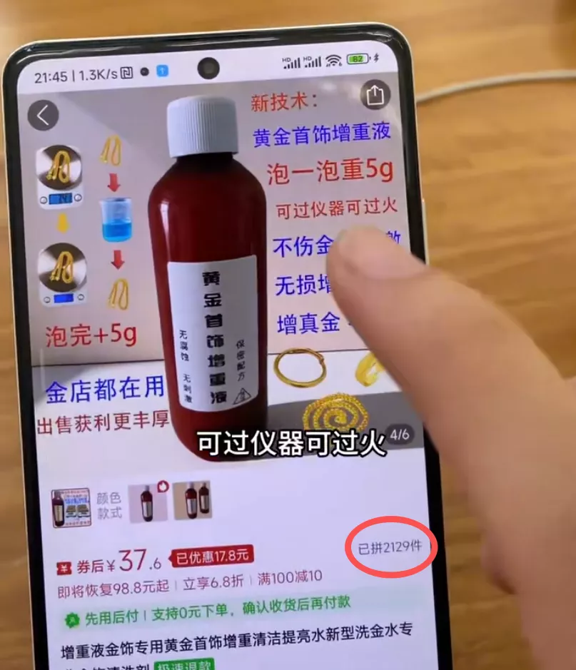“泡一泡,黄金多5克!”10月12日,四川成都一家金店老板在抖音社交平台发布这样一条短视频:拼多多“德威特科技”等店铺正在售卖一款“黄金增重液”的产品,售价37.6元起,商品页显示已拼2129件,评论区有多条“真增重了”的用户留言。