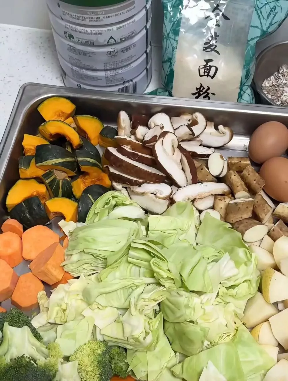 她已经精心切了两个贝贝南瓜、一堆红薯、一群香菇山药莲花白。