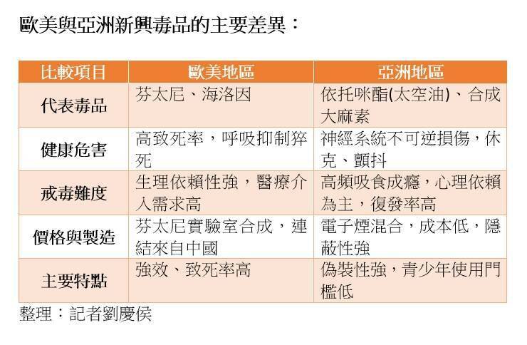 根据联合国「二○二四年世界毒品报告」揭露,全球吸毒人口攀升至三点一六亿,创历史新高。欧美与亚洲因社会结构、毒品政策差异,衍生截然不同的新兴毒品威胁,从成分、毒性到流通模式均呈现两极化发展。