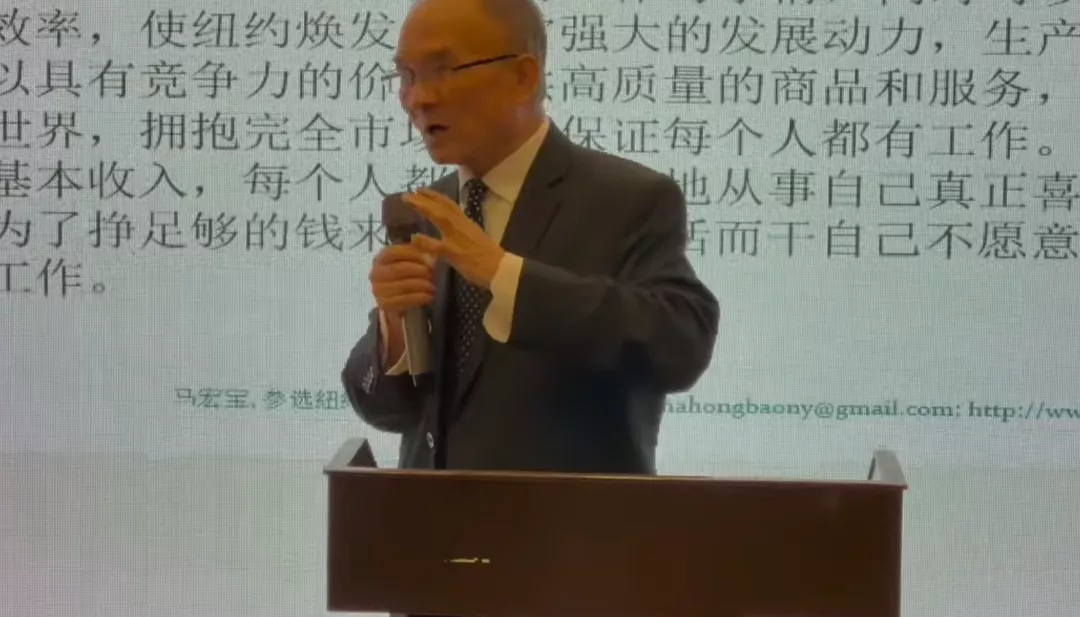 马宏宝在演讲中表示,他的参选不是为个人名利,而是希望“让纽约人过上更有尊严、更幸福的生活”。