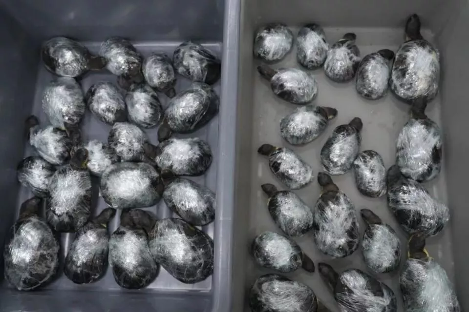 10月21日,海关发布发文《龟龟的天终于亮了》,详情如下:近日,文锦渡海关查获两名进境旅客绑藏外来物种活体侏儒侧颈龟68只。