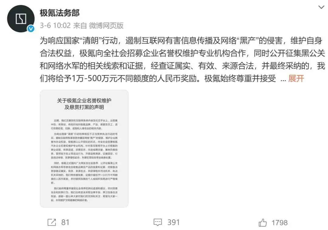 极氪汽车更大气一些,悬赏征集黑公关的奖励金额最高可达500万元。