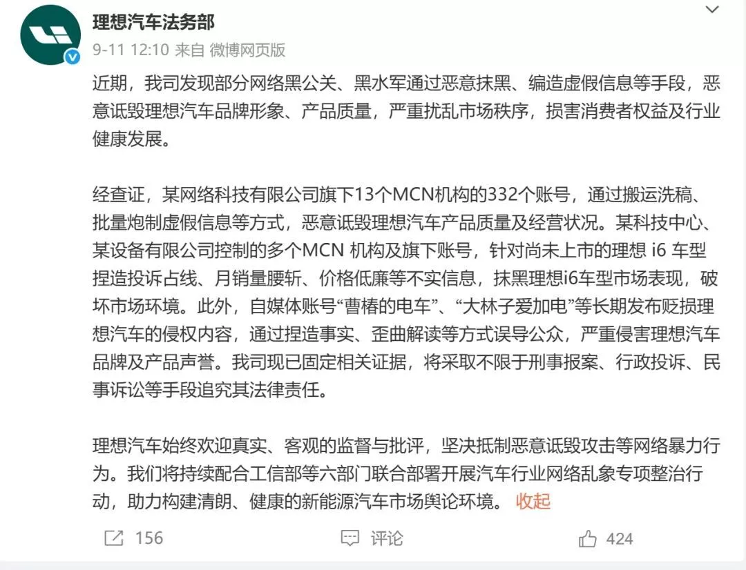 还有理想汽车,也说他们是网络黑公关、黑水军的受害者,现已固定相关证据,将采取不限于刑事报案、行政投诉、民事诉讼等手段追究黑公关的法律责任。