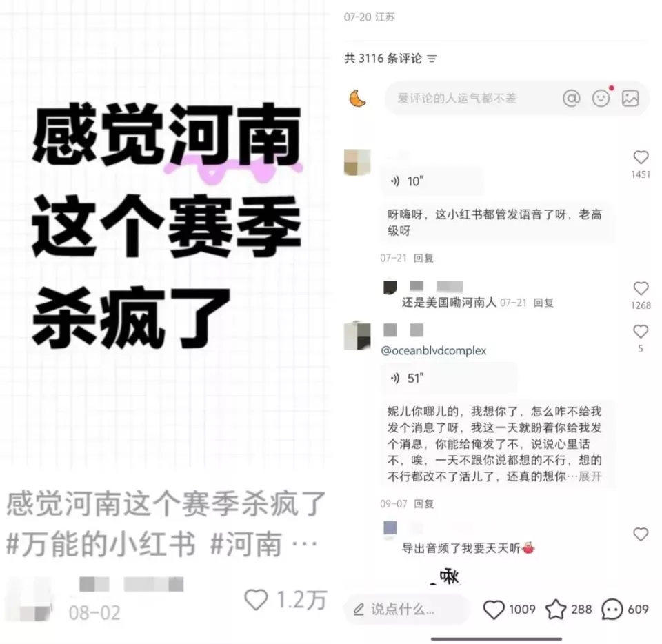 今年,小红书推出评论区可发语音的功能后,不少网友开始用方言交流,这同样给河南话叠加了“出圈buff”。截至2025年9月,“河南话”标签在小红书上已有1.6亿次浏览量。有网友发帖,仅凭一句“感觉河南在这个赛季杀疯了”就喜提1.2万个赞,下方第一条评论附和道:“我最近天天在各种评论区听河南人说话,真的很好听。”