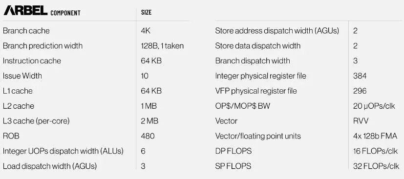 具体而言,Arbel 核心在整数端拥有一个 10 位宽的发射解码器和 6 个 ALU,在矢量端拥有 4 个 128 位
