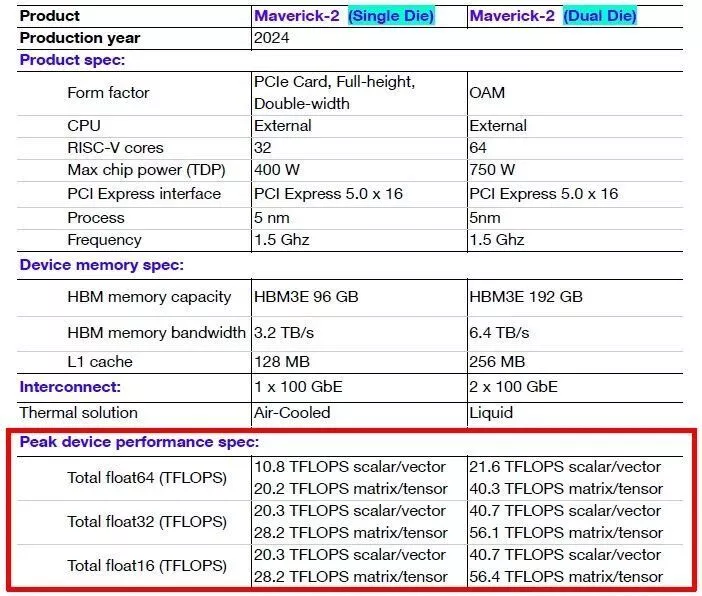 400W,并采用风冷散热。双芯片 Maverick-2 则有效地将所有这些功能翻倍,但它需要接入 OAM(OCP