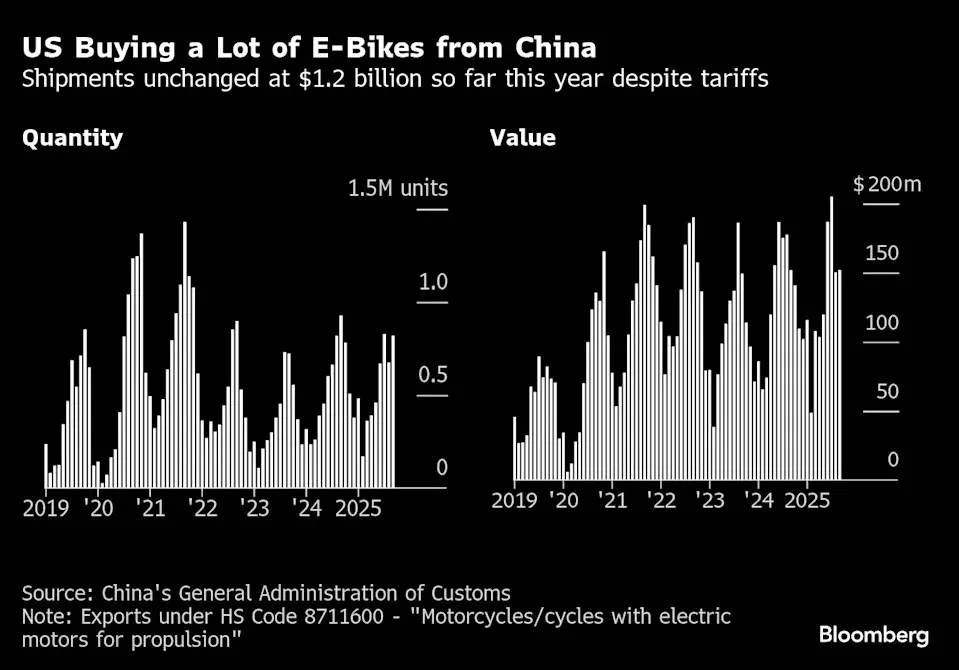 根据彭博对中国海关数据的分析,儘管上季度对美出口前十的商品几乎全部同比下滑,但电子烟出口却在成长。另外,美国对电动助力自行车的需求也十分强劲,第三季度中国企业出口的电动助力自行车超过5亿美元,略高于去年同期。