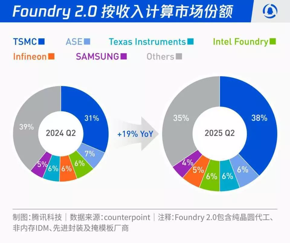 2.0营收排行数据,截至2025年Q2,英特尔代工的收入同比微增3%,市场占比持平,维持在6%,而台积电增幅达到44%,份额从31%扩大至38%。