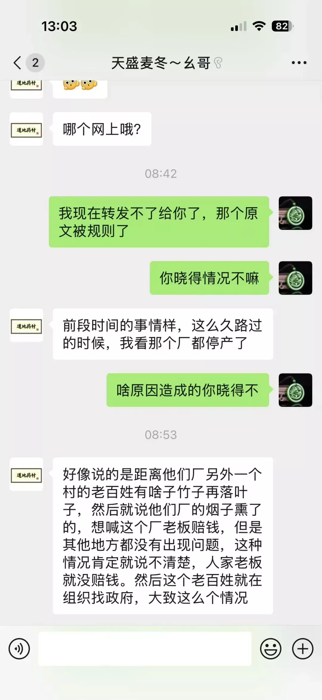 10月22日,微信名为“AZ”的成员在群里投下了另一枚“重磅炸弹”——4张与一位名叫“天盛麦冬幺哥”的微信聊天截图。这位“幺哥”在对话中,将整个污染事件描绘成一场由个人贪欲引发的闹剧。
