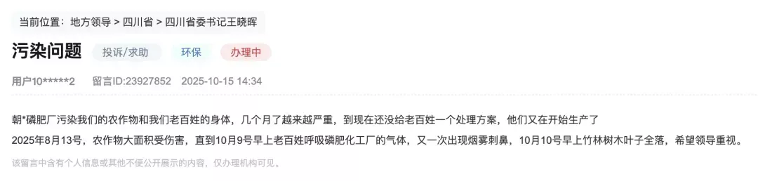 一天后,另一位用户向四川省委书记发出了更详细的求助:“朝*磷肥厂污染我们的农作物和我们老百姓的身体,几个月了越来越严重……2025年8月13号,农作物大面积受伤害,直到10月9号早上老百姓呼吸磷肥化工厂的气体,又一次出现烟雾刺鼻,10月10号早上竹林树木叶子全落,希望领导重视”。