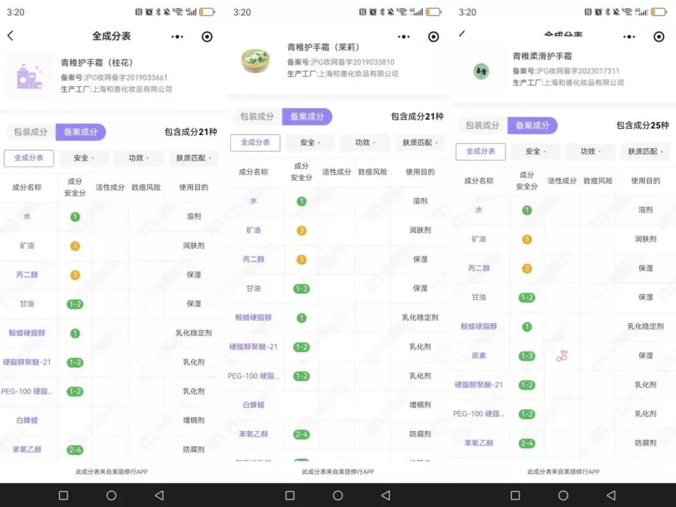 图 | 青稚三款不同护手霜的配方,