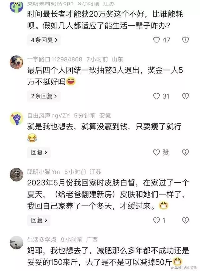 针对此事,有网友评论,时间最长者才能获20万奖这个不好,比谁能耗呗。假如几人都适应了能生活一辈子咋办?
