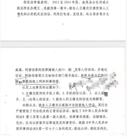 2017年8月11日,曲周县法院作出一审判决,以犯妨害作证罪判处王曙光有期徒刑二年六个月。王曙光不服提出上诉。2017年10月23日,邯郸中院驳回上诉,维持原判。