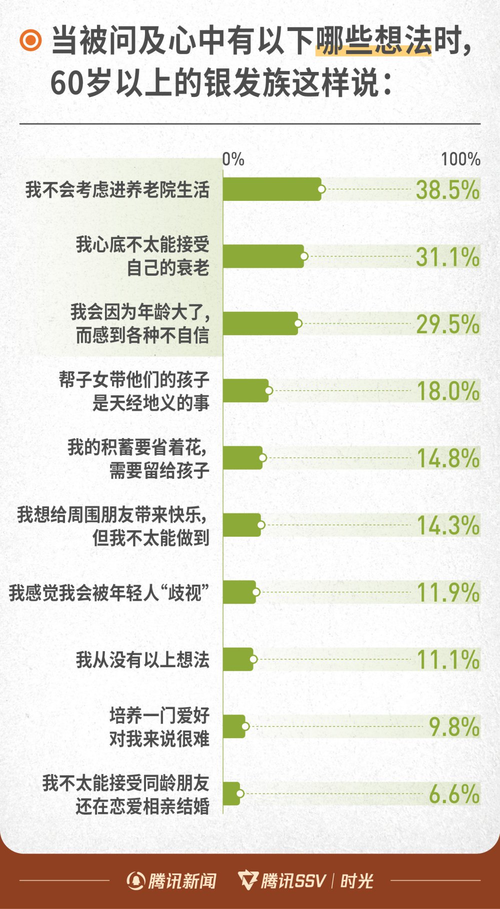 面对衰老和未来,银发族的心态复杂而微妙:近四成受访的60岁+人士会说“完全不会考虑进养老院”。“信不过”、“进去等于放弃尊严、自生自灭”是我们听到最多的回答。