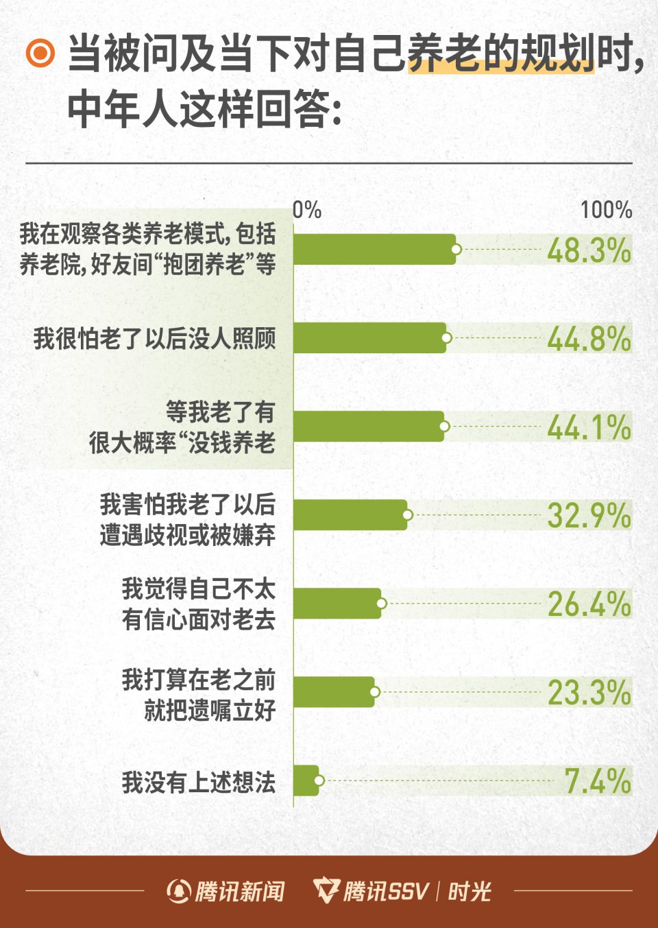 值得一提的是,中年人对未来自己进养老院持开放态度,近半的受访者在关注包括养老院、好友抱团养老在内的新兴模式。同时,老后照顾、是否有足够积蓄养老都是受访的中年人普遍担心的问题。“老之将至”的隐忧,促使他们早早开始为自己绸缪。