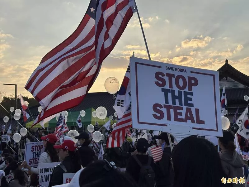 逾百名反中群众集结,拿出“天灭中共”、“停止窃国”、“韩国属于韩国人”等标语,并挥舞韩国及美国国旗。(记者黄靖媗摄)