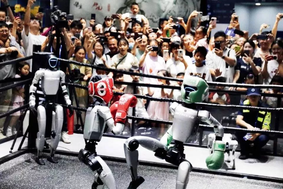 2025年9月27日,浙江杭州,人们在第四届全球数字贸易博览会期间观看人形机器人进行格斗擂台赛。图/中新