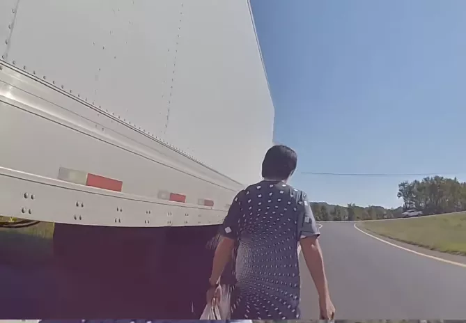 视频最后,警官暂时吊销了司机的驾照,只见司机无奈地拎着个人物品离开卡车。