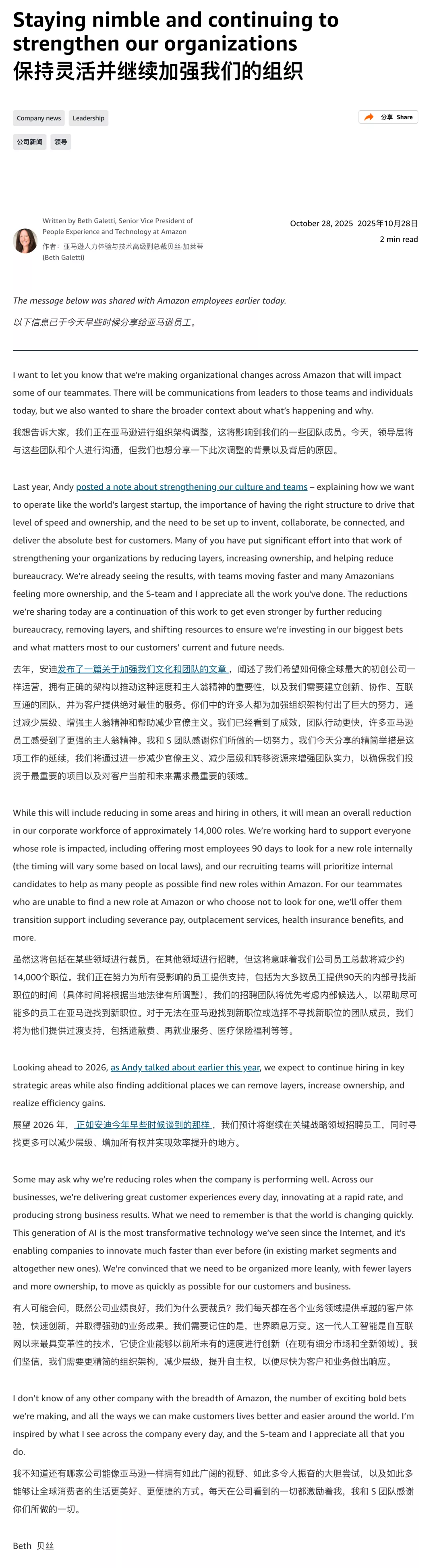 亚马逊的人力资源主管 Beth Galetti,在给全体员工的备忘录中写着,「AI 是自互联网以来,我们所见过的最具变革性的技术」。