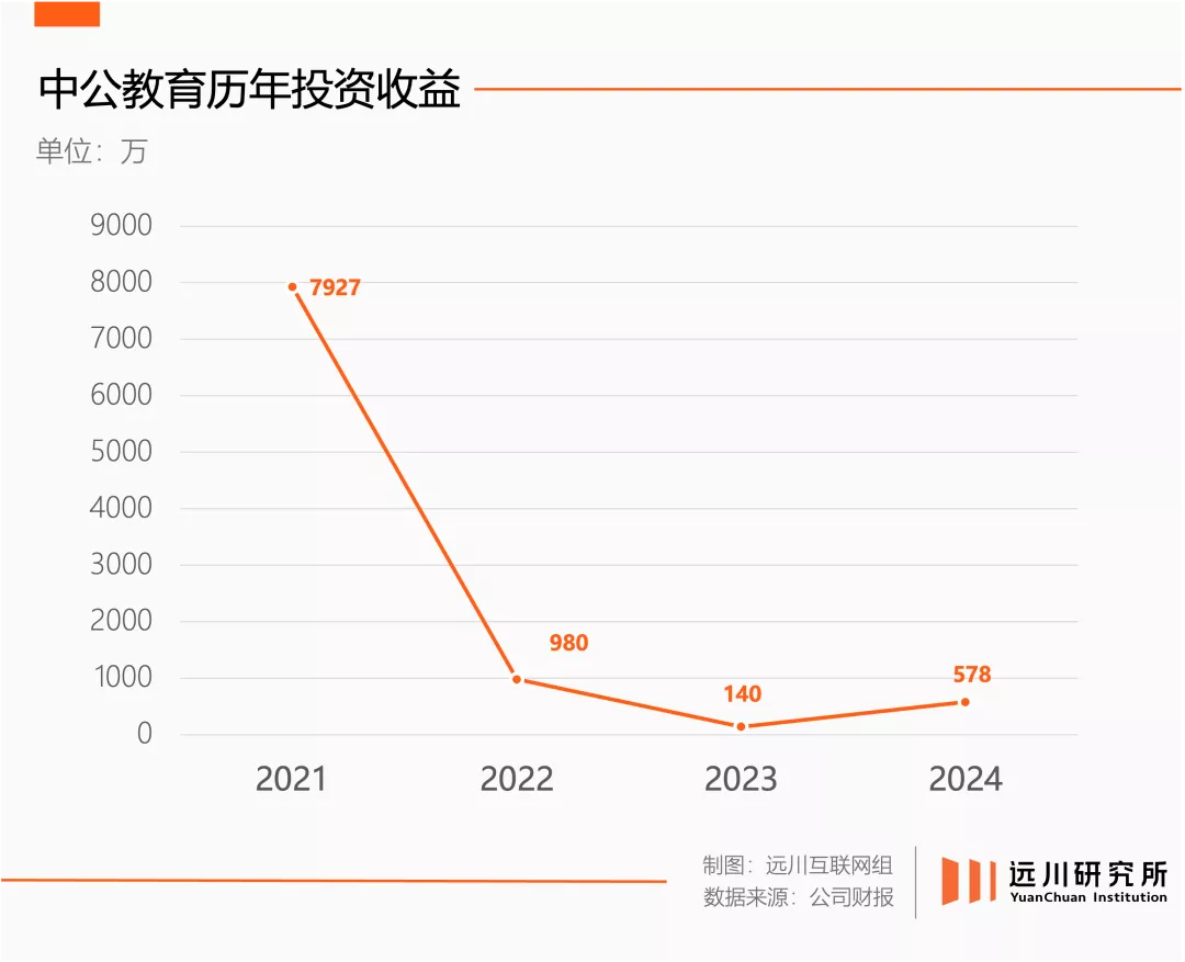 2021年,中公教育投资收益7927万,但在近24亿的亏损面前杯水车薪。此后几年理财收益还在光速萎缩,去年中公教育艰难盈利,投资对利润总额的贡献只有两个点。