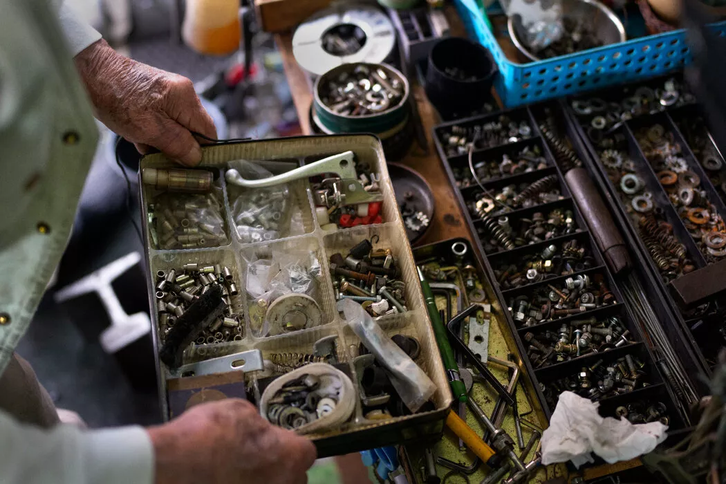 现年103岁的石井先生依然热爱拆卸螺栓和轮胎,将零件重新组装复原,尽管双手已不再如从前那般听使唤,视力也不复年少时的清晰。