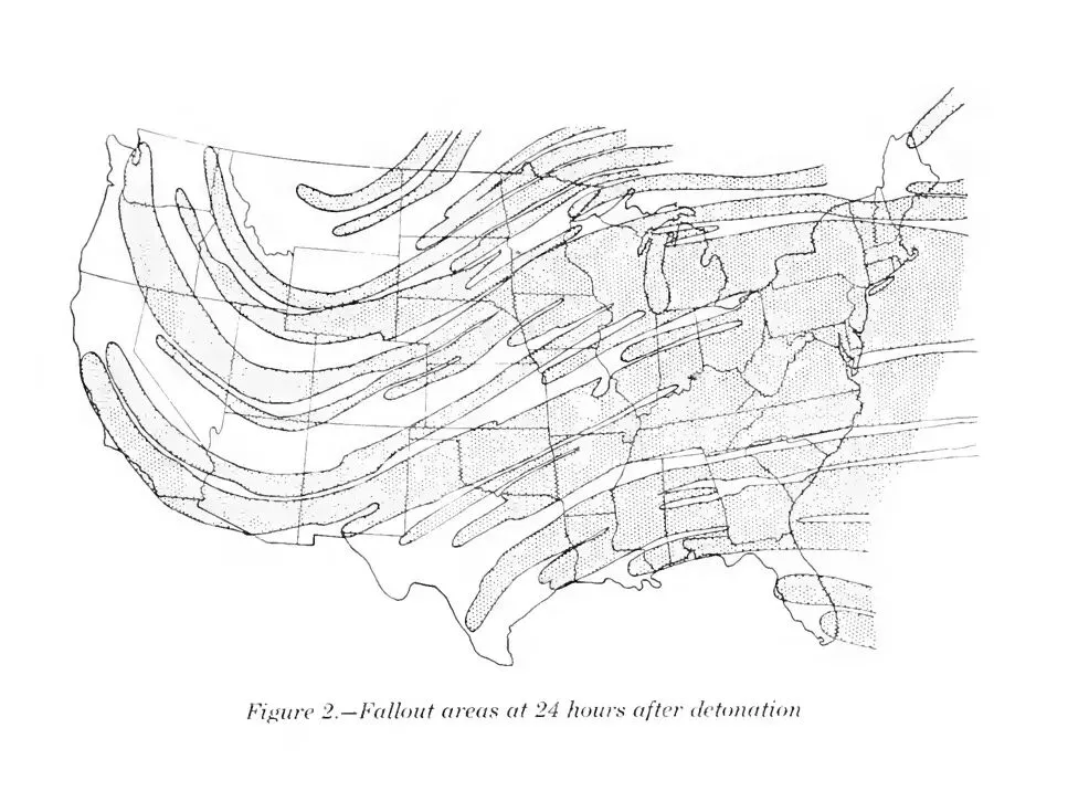 为了提醒美国民众不把核威胁视作儿戏,指南开宗明义地指出了美国本土容易被打击的目标,并贴心地推导了核战争对普通民众的影响——根据气象预测,巨量的核辐射和尘埃将在行星风系的吹拂下,仅用24小时覆盖美国全境。