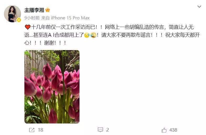 其中刘芳菲与李湘先后发文澄清了这件事,李湘还因此被我网友用AI合成了她被释永信亲吻手背的视频。