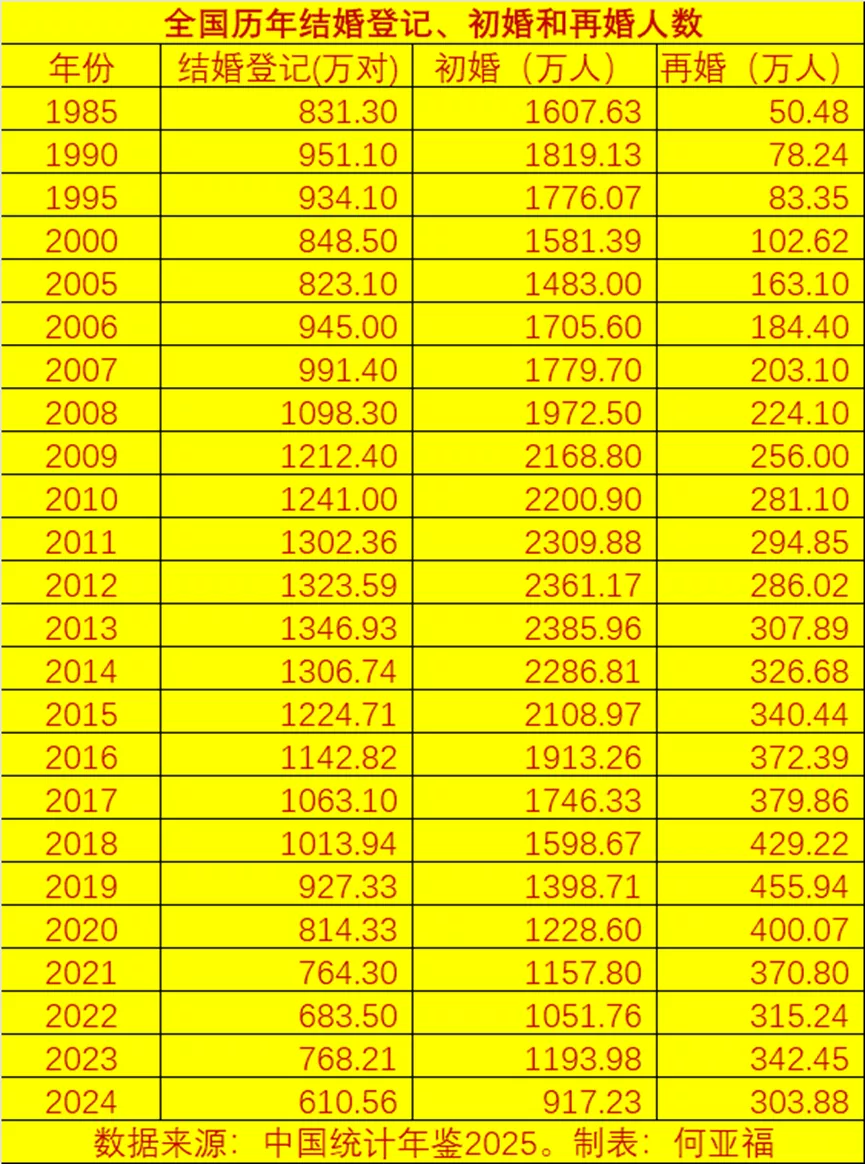 国家统计局最近出版的《中国统计年鉴2025》公布了2024年的结婚数据。