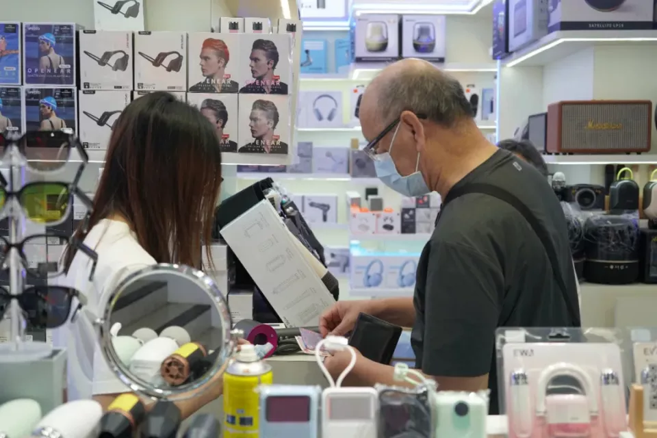90后小雨在华强北做档口已经近10年,以前专卖自家工厂生产的蓝牙耳机。今年5月,她把门面重新装修,挂上了“AI穿戴”的招牌,开始主卖AI翻译耳机。